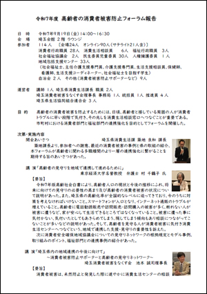 高齢者の消費者被害防止フォーラム 埼玉県委託事業 高齢者の消費者被害防止フォーラム開催報告 超高齢化が進む中、消費者被害防止のためには、消費者被害の兆候に気付き適切な機関に繋ぐことが重要です。地域の見守りに関わる多様な組織等との連携強化をすすめるための機会とします。 「令和7年度高齢者の消費者被害防止フォーラム開催報告」はこちら【PDF:324KB】 令和6年度高齢者の消費者被害防止フォーラムの報告はこちら