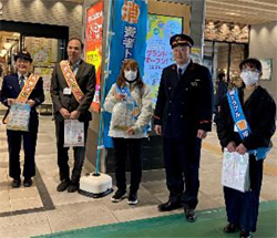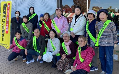 草加駅頭、東武鉄道草加駅駅長、草加警察署、草加市消費者行政職員と連携し啓発活動をおこないました。消費者トラブルのぼり旗を立て、サポーターもタスキを掛け消費生活センター周知の啓発品を配布しました。