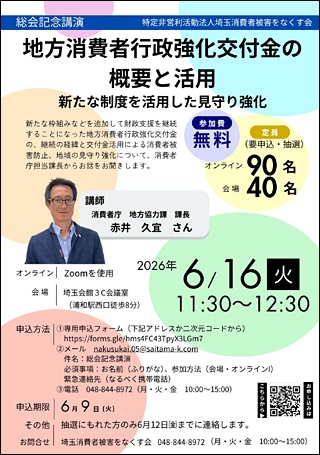 消費者庁地方協力課課長 赤井久宜さんを講師に迎え、交付金活用による消費者被害防止、地域の見守り強化についてお話をお聞きします。詳細は案内チラシをご覧ください。